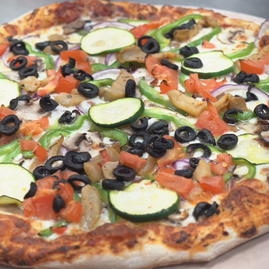 Garden Pizza (mushrooms, onions, peppers, zucchinis, marinated eggplants, tomatoes, black olives)