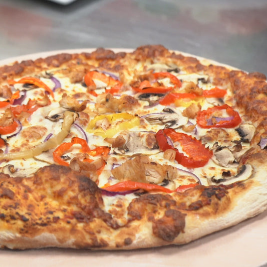 Chicken Piri Piri Pizza (spicy chicken, onions, mushrooms, cheese, banana peppers)